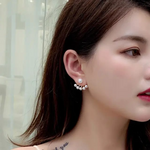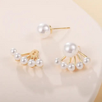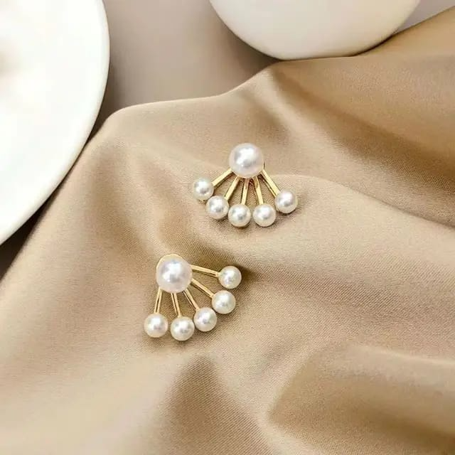 • Design: A striking and elegant stud earring design featuring a large central pearl and a fanned-out arrangement of five smaller pearls below, connected by fine gold-tone arms. This radiant structure gives a contemporary twist to a classic pearl look.
