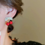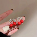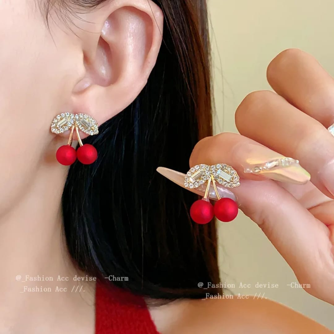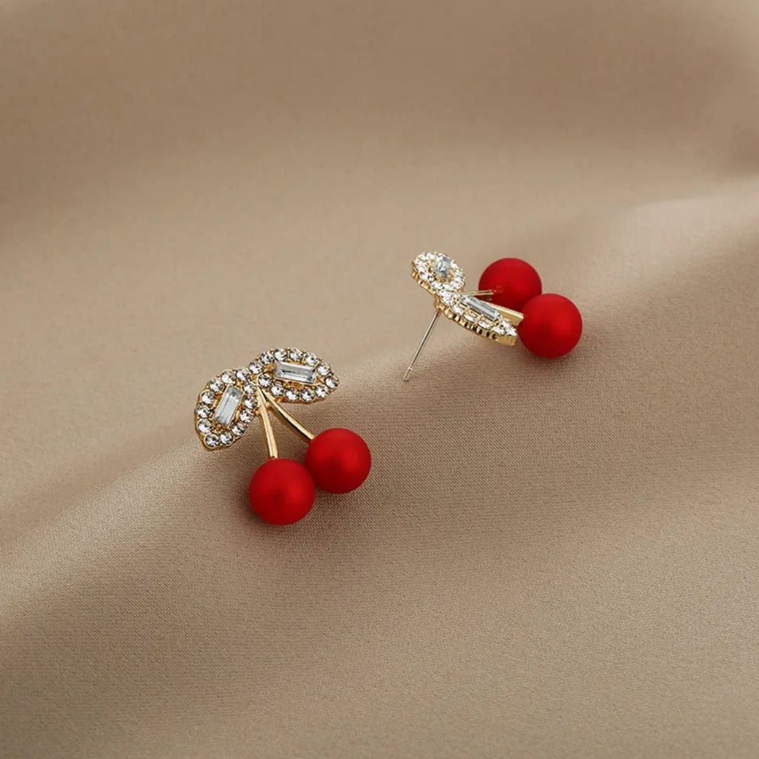 Playful, chic, and undeniably charming — the Cherry Sparkle Crystal Stud Earrings bring a pop of color and whimsy to any outfit. Featuring two vibrant matte red cherry drops suspended from glittering gold stems, the earrings are topped with dazzling leaf-shaped studs adorned with clear baguette and round crystals. The perfect mix of fun and elegance, these earrings are a standout accessory for youthful, lively looks.