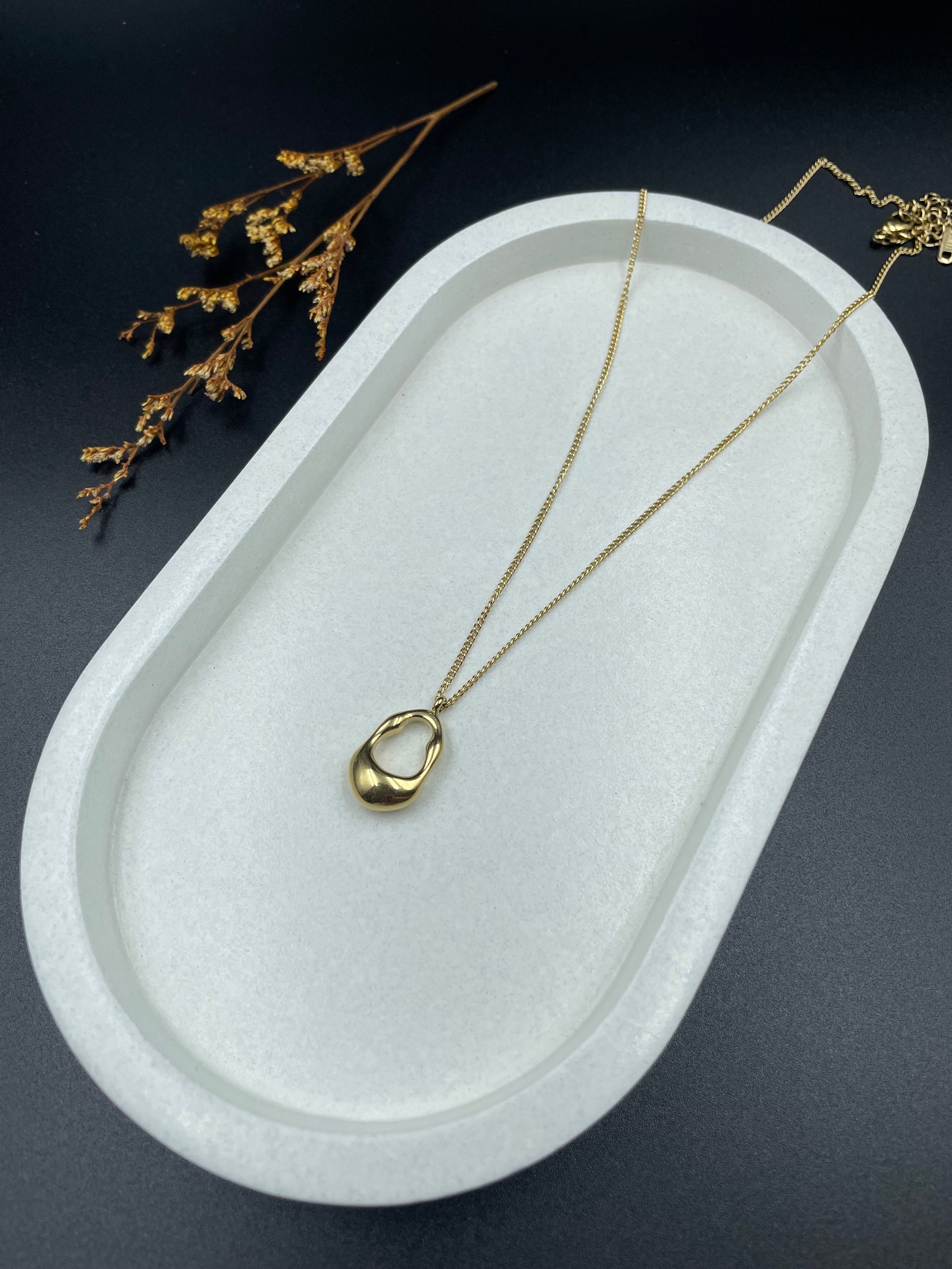 Where form meets flow. The Sol Melt Pendant is a bold yet minimalist statement inspired by molten metal and organic curves. This sculptural drop-shaped pendant features a fluid silhouette with an open center, cast in a radiant gold finish and paired with a fine chain that complements its contemporary character.