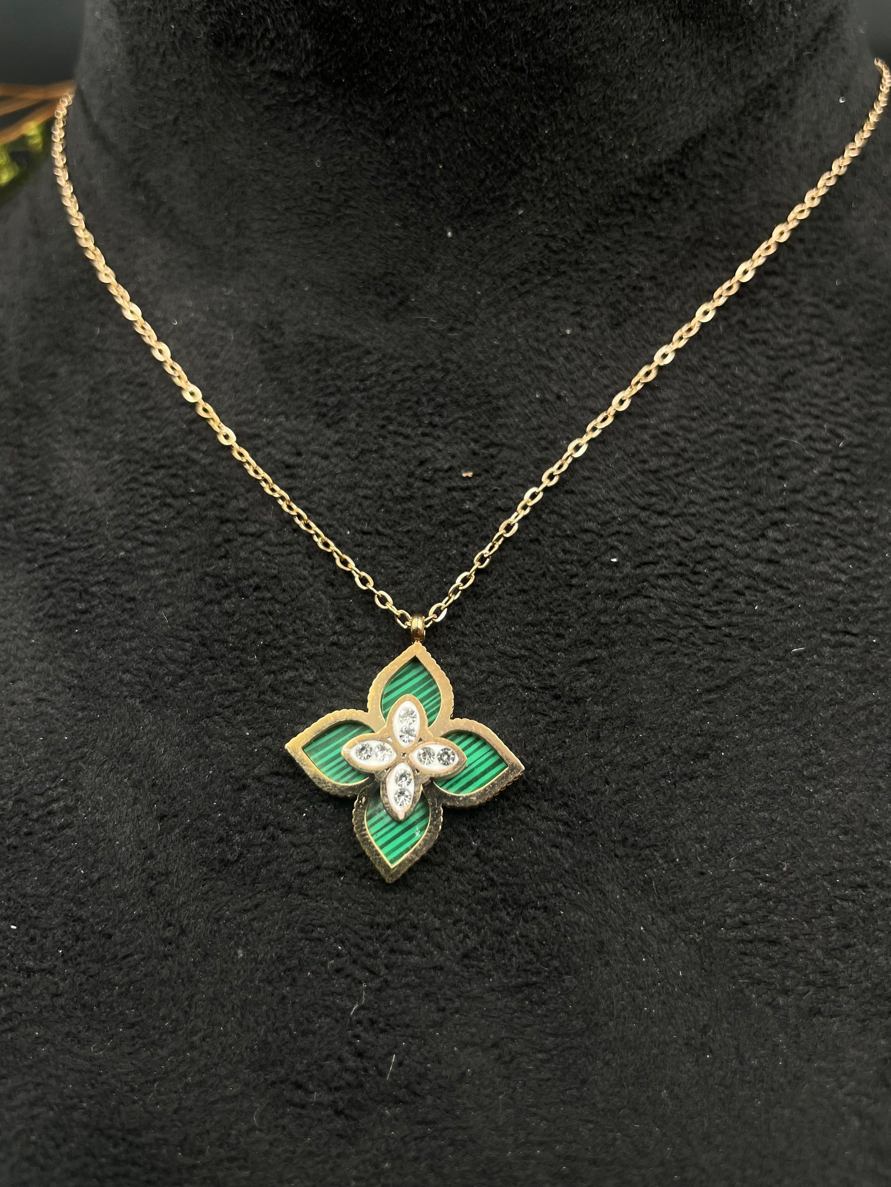 Elevate your elegance with the Emerald Bloom necklace — a stunning floral pendant framed in gold with vivid green enamel and sparkling cubic zirconia. Designed to channel both vintage charm and modern luxury, this piece is perfect for statement-making sophistication.