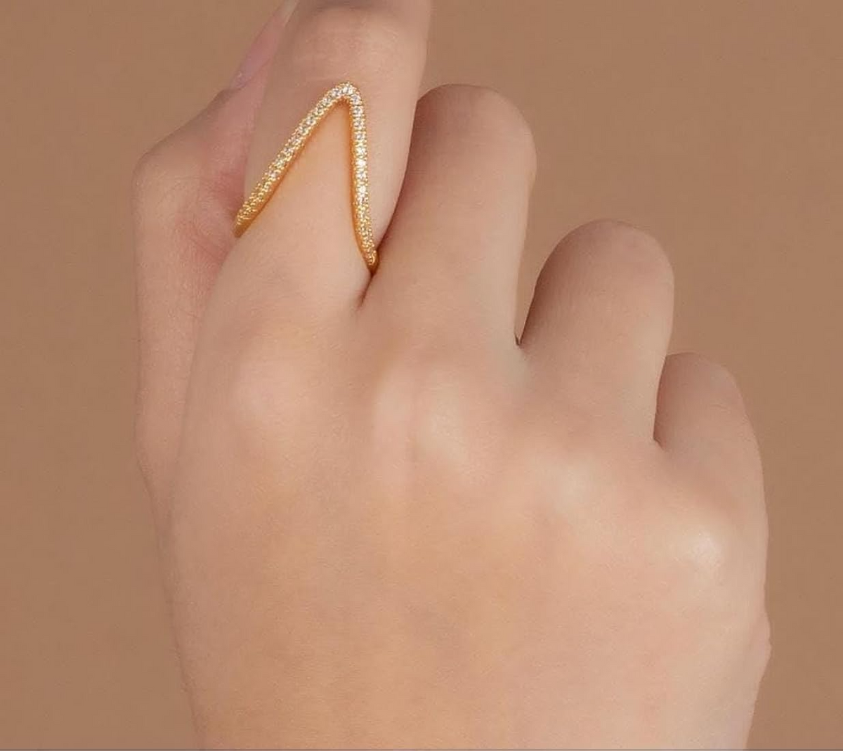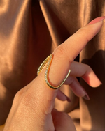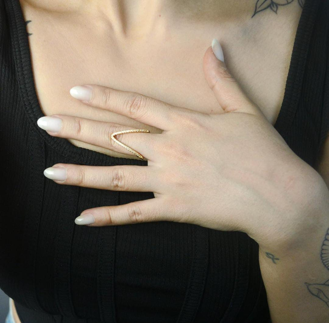 Sculptural elegance meets subtle glam in the Golden V-Curve Sparkle Ring. With its striking V-shaped design and a sleek gold-tone finish lined with shimmering crystals, this ring makes a bold yet refined statement.